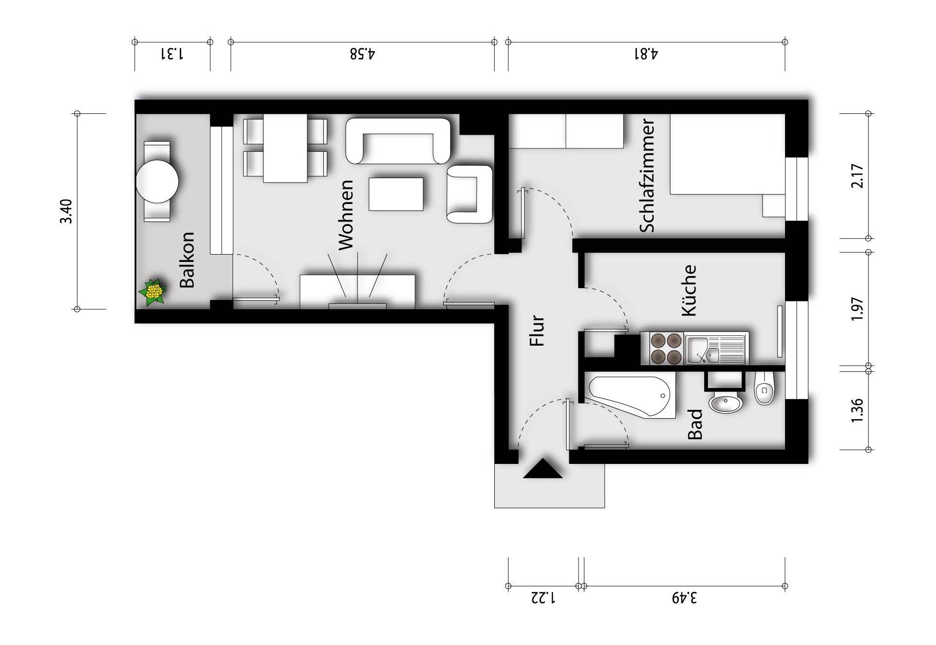 Dieses Wohnungsangebot beinhaltet die Übergabe der Wohnung mit Tapetenbelag und Anstrich.